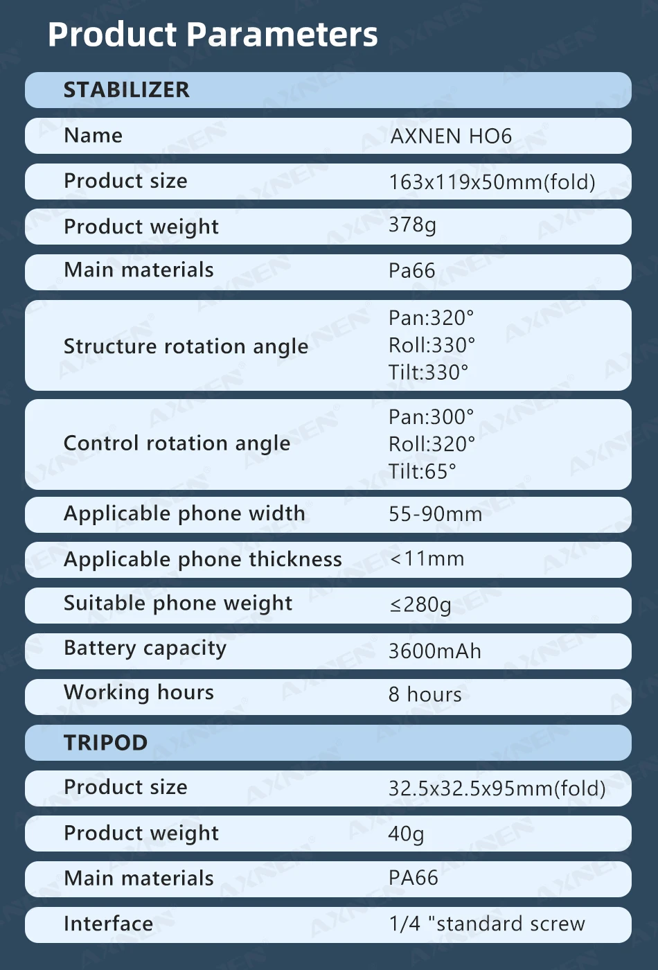- Estabilización de 3 ejes: Ángulo de inclinación 65°, balanceo 320°, giro 300°.